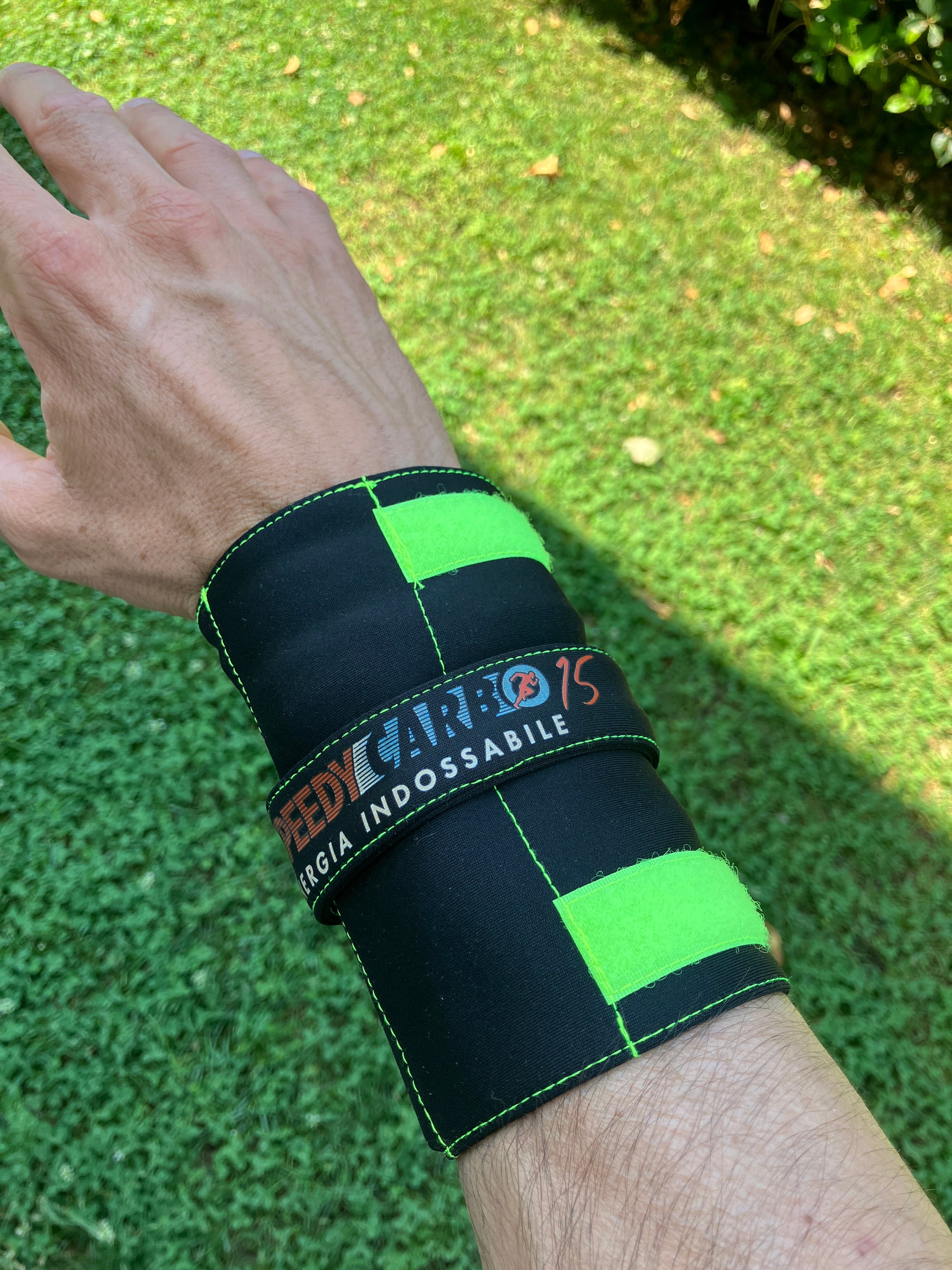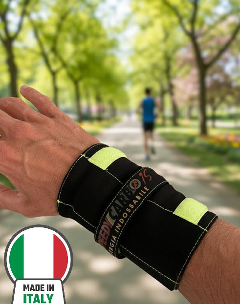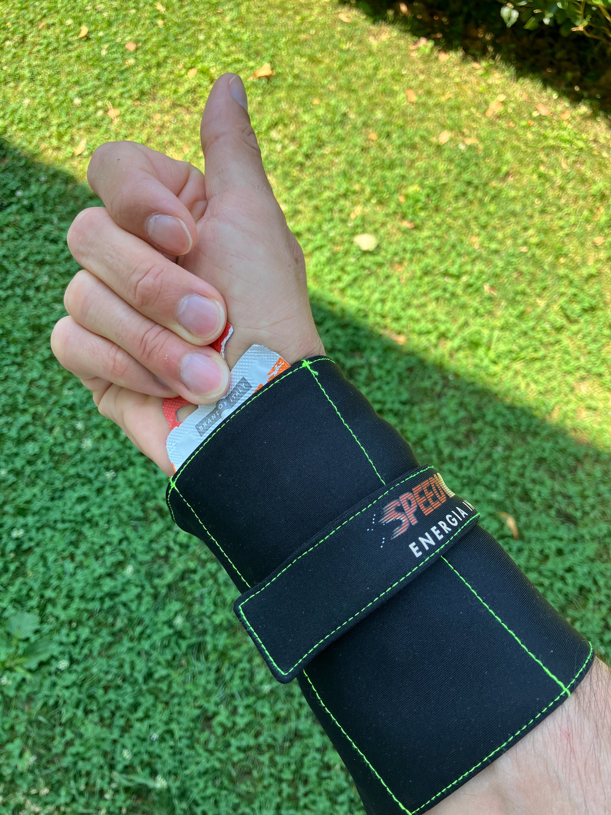Due tasche elastiche discrete, perfette per portare sempre con te, al polso o alla caviglia, almeno due bustine di SpeedyCarbo, senza fastidi o ingombri.